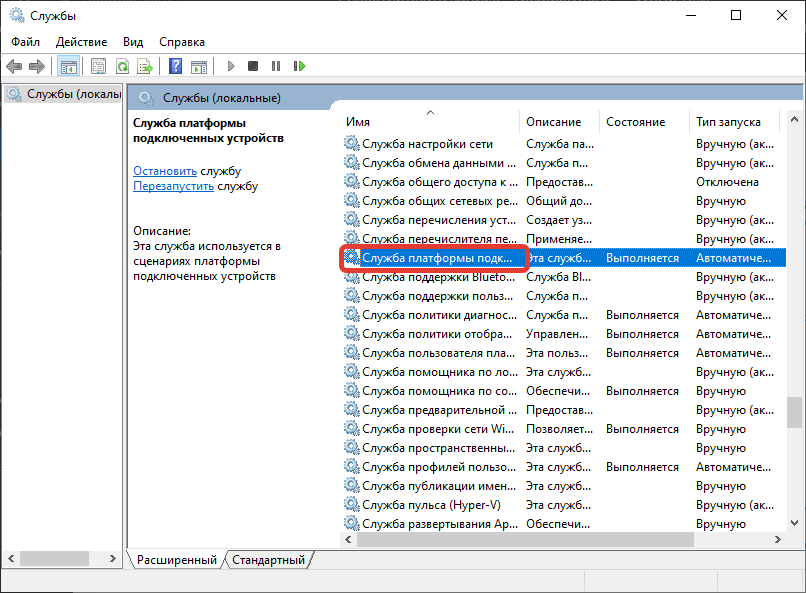 - В списке отыскать строки «Посредник подключений к сети» и «Служба платформы подключенных устройств».