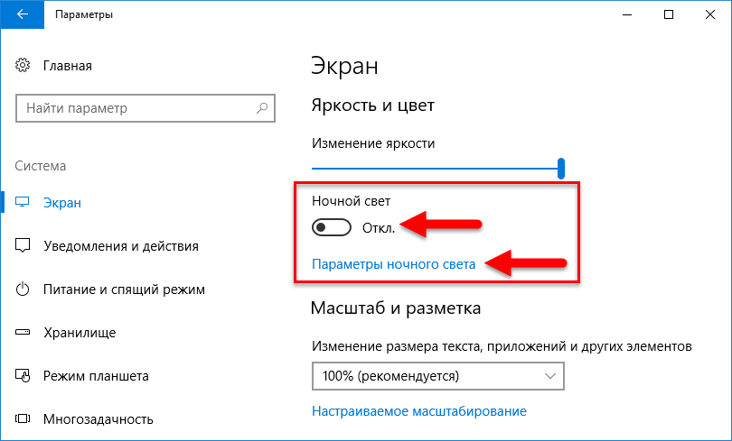 Отключить «Ночной свет» в Windows 10 можно в тех же параметрах «Экрана» переводом переключателя в обратное положение: