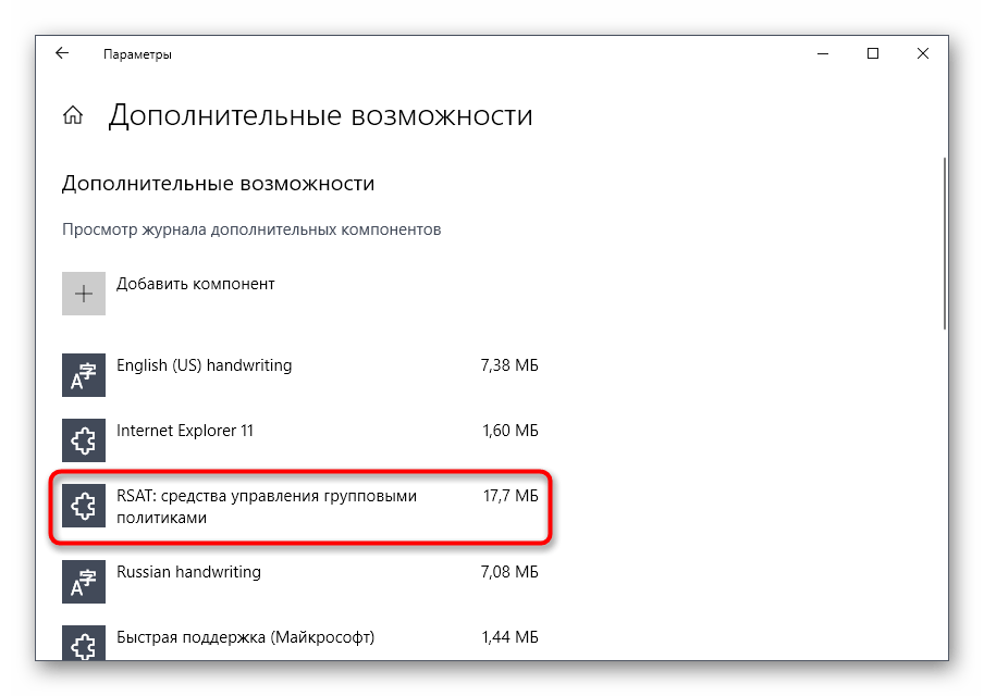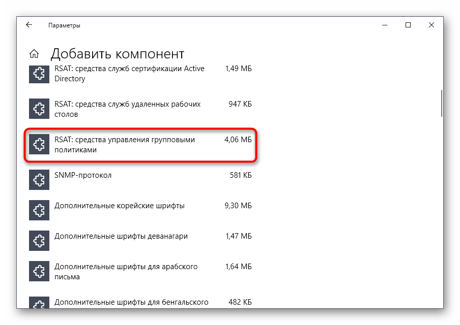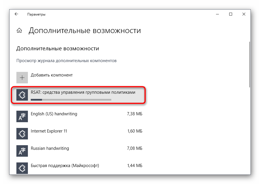 В списке отыщите «RSAT: средства управления групповыми политиками» и запустите установку.