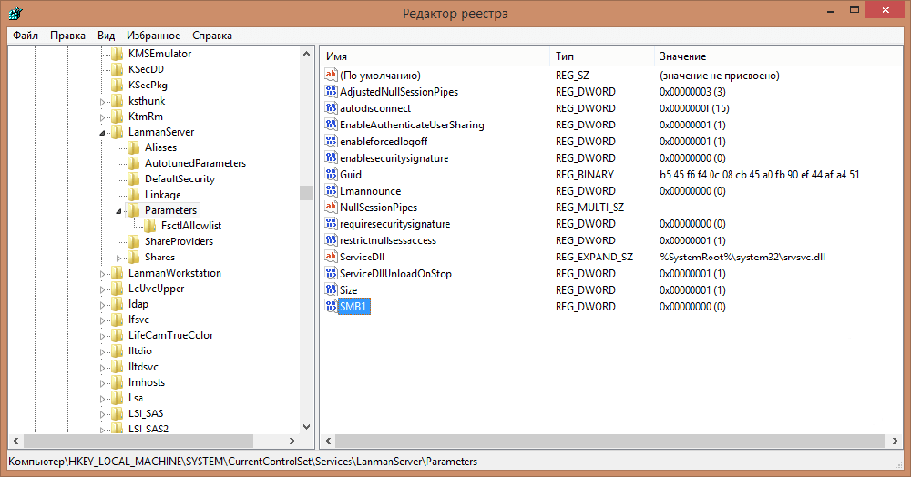 - Путь раздела: SYSTEMCurrentControlSetServicesLanmanServerParameters