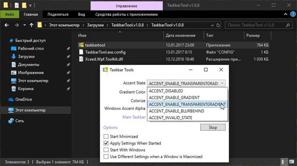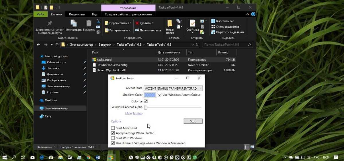 Параметры как на скриншоте TaskbarTools делают панель задач полностью прозрачной и отключают эффекты размытия для находящегося позади неё изображения. Достаточно попробовать разные опции, чтобы добиться нужного результата. Ниже — пример 100% прозрачности.