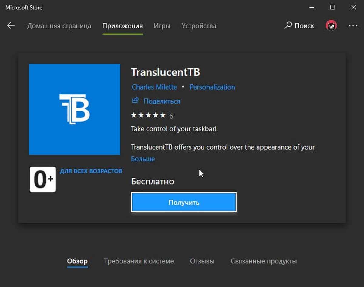 Найти TranslucentTB и нажать кнопку «Get» на странице программы.