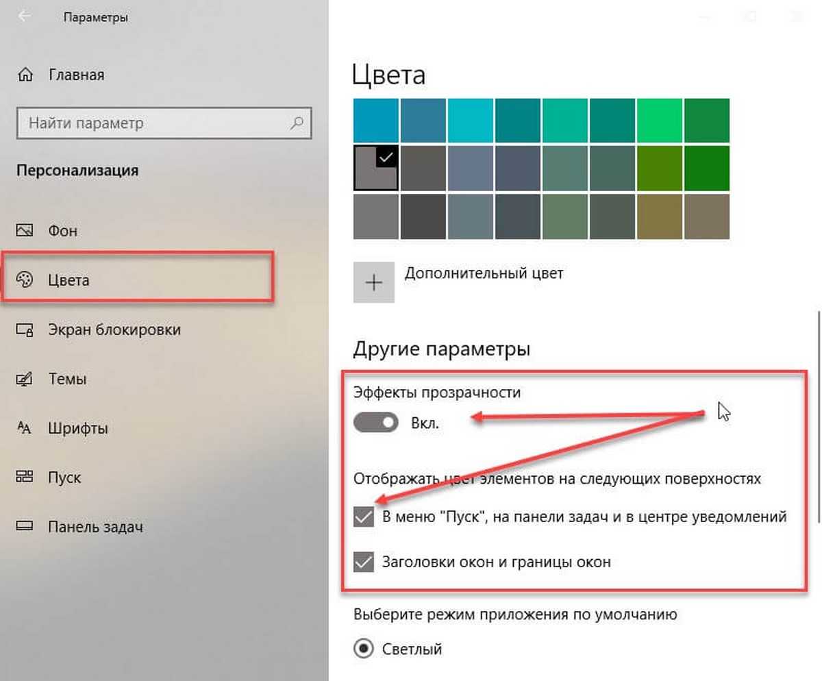 - Зайдите в параметры персонализации Windows 10, в разделе «Цвета» отключите и снова включите эффекты прозрачности.