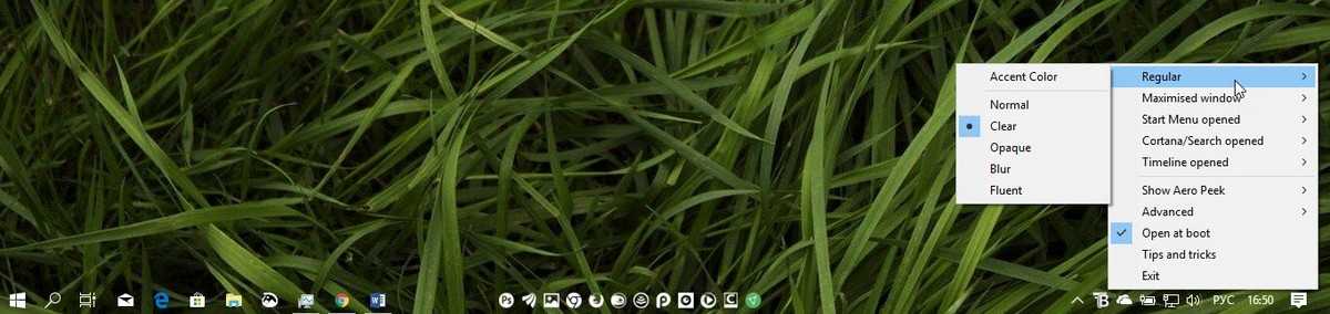 - Fluent, размытие, прозрачность, цветной и непрозрачный эффект панели задач.