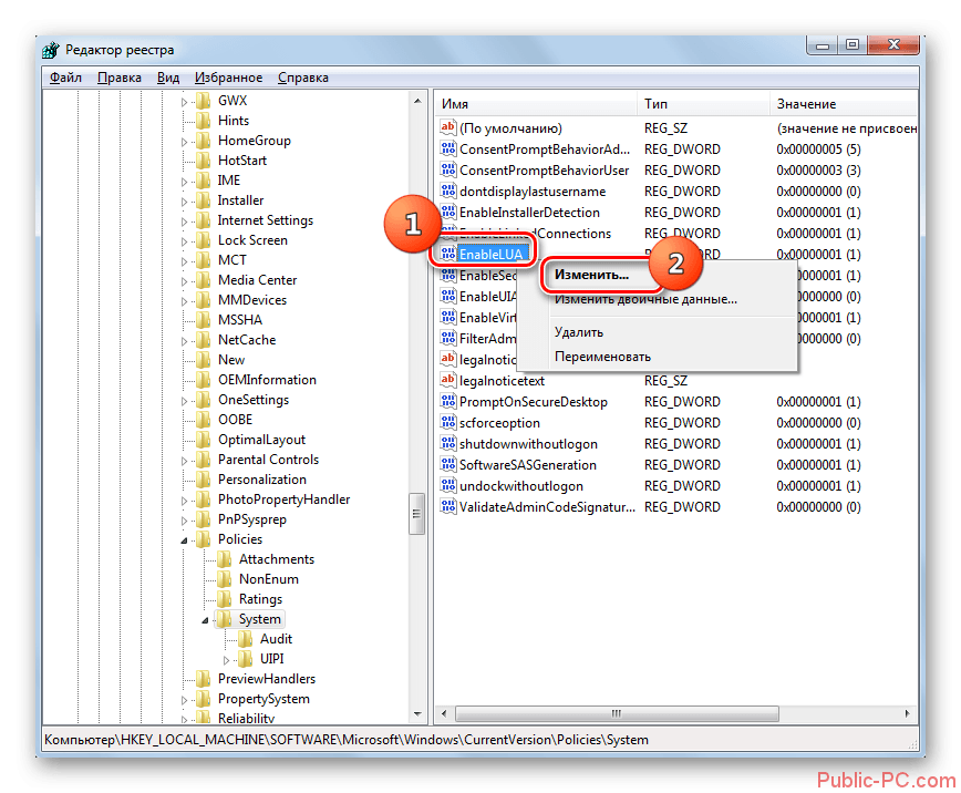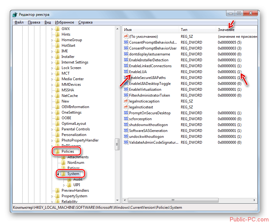 Наконец, последовательно перейдите по веткам «Policies» и «System». Выделив последний раздел, перемещайтесь в правую часть «Редактора». Ищите там параметр под названием «EnableLUA». Если в поле «Значение», которое относится к нему, установлено число «1», то это означает, что UAC включен. Мы должны сменить данное значение на «0».