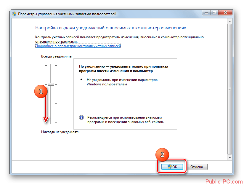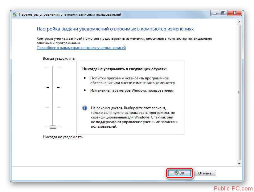 Сразу становится понятно, как отключить UAC – необходимо переместить ползунок в нижнее положение и нажать «Ok».