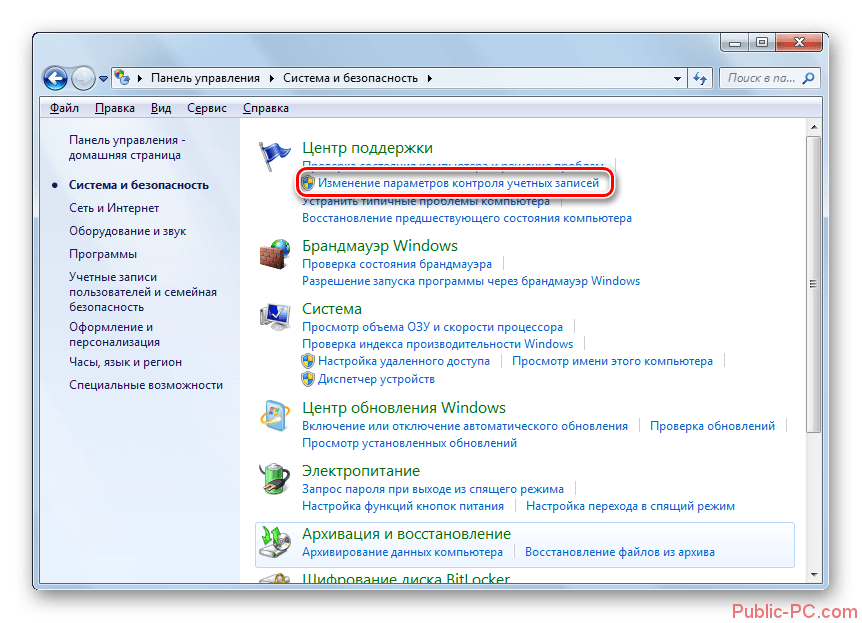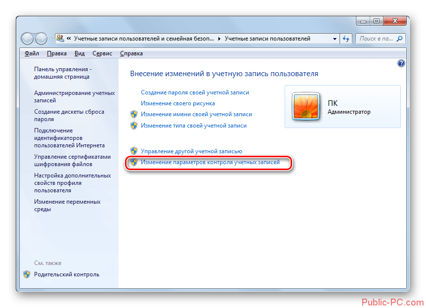3. Выберите пункт, соответствующий данной записи «Изменение параметров контроля учетных записей»;