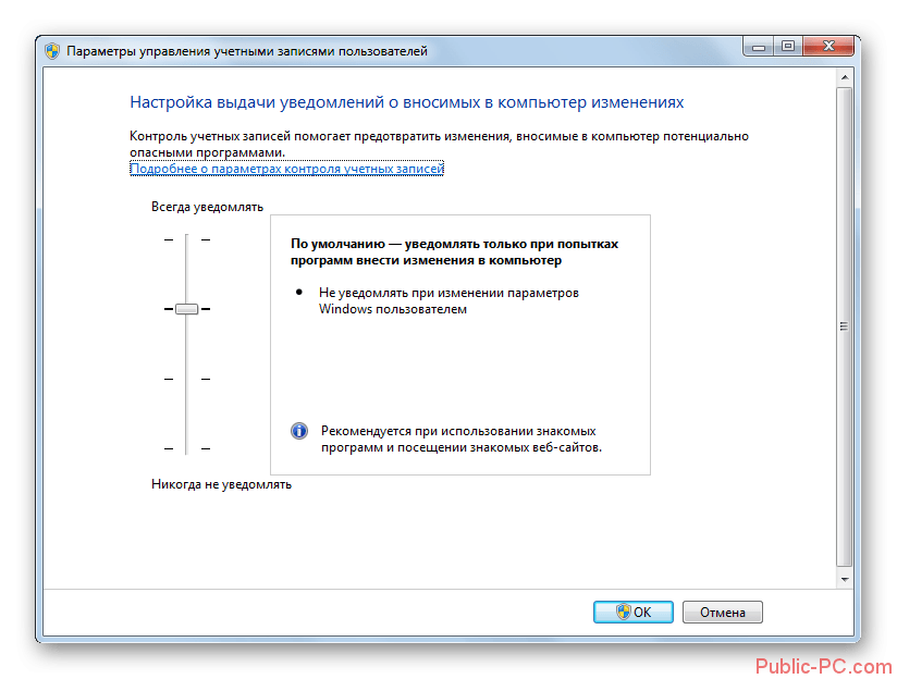 И вот, собственно, перед нами настройки UAC. У UAC есть 4 уровня, регулируемых ползунком на шкале уведомлений этой функции. По умолчанию в Windows установлен не наивысший уровень, но оптимальный, третий (снизу).