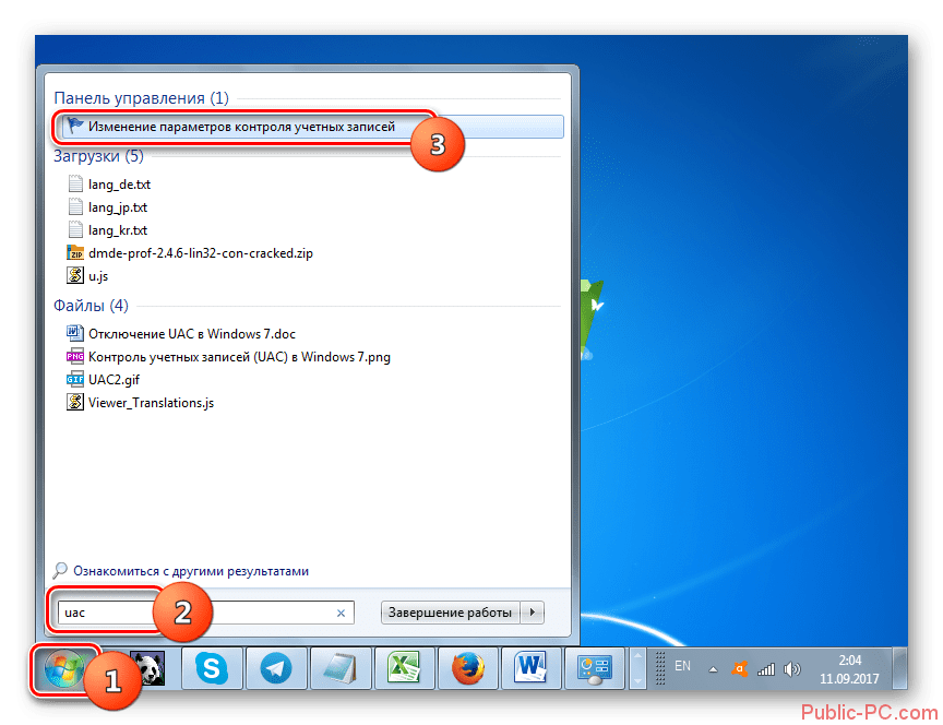 Во всех трёх актуальных версиях Windows – 7, 8.1, 10 – отключение UAC происходит одинаково. Чтобы отключить эту функцию, можно ввести её аббревиатуру во внутрисистемный поиск и запустить настройки в панели управления, отвечающие за контроль учётных записей.