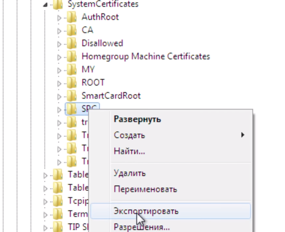 Шаг 4. Проделайте те же действия со второй веткой «HKEY_LOCAL_MACHINE»-«SOFTWARE»-«Microsoft»-«SystemCertificates»-«SPC»: