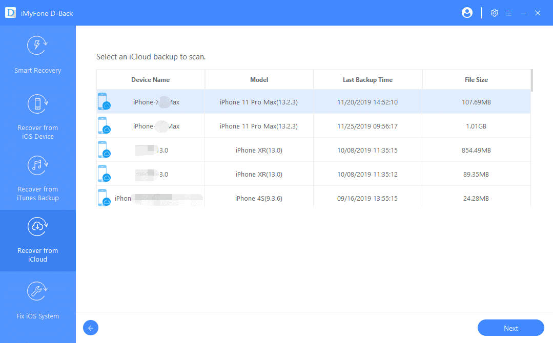 Теперь, D-Back начнет поиск всех резервных копий iCloud, находящихся под вашей учетной записью. После этого вы должны выбрать соответствующую резервную копию iCloud, из которой вы собираетесь восстанавливать видео. Затем нажмите кнопку с надписью «Следующая” продолжать.