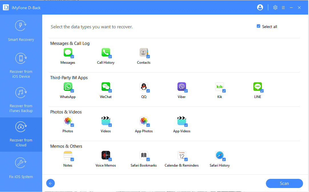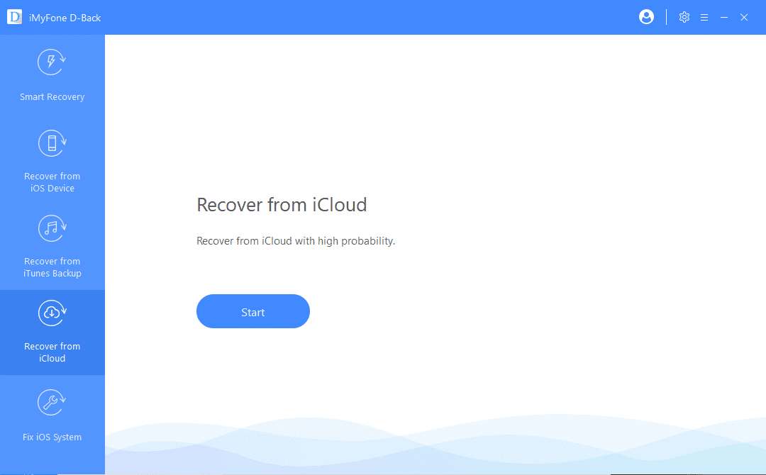 В главном окне iMyFone D-Backнайдите параметр «Восстановить из iCloud» и щелкните его. Затем нажмите на опцию «Start” также. Вам необходимо войти в учетную запись iCloud, используя учетные данные, и выбрать «ICloud Резервное копирование»Вариант. Затем нажмите на опцию «Scan”.