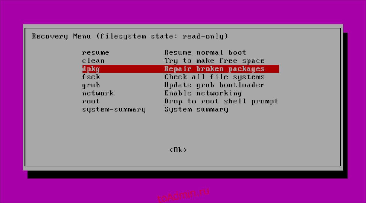 Параметр «Dpkg», доступный пользователям Ubuntu в режиме восстановления, позволяет исправлять и удалять любые потенциально поврежденные пакеты, которые вызывают проблемы в вашей системе.