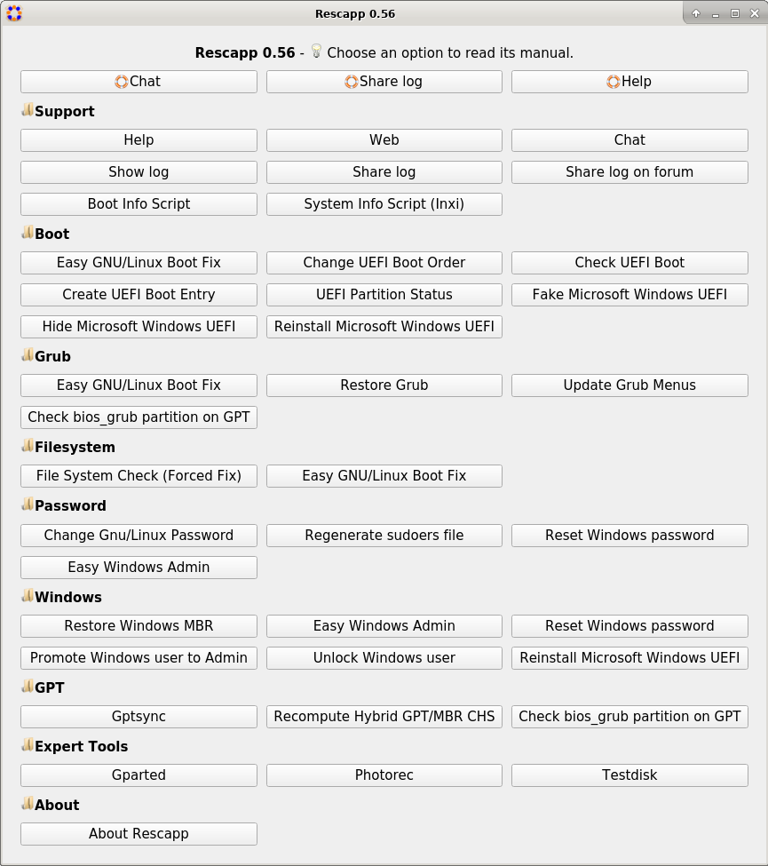- Share log: After running an option you can share its log (the action registry that it has done) so that in the chat they can help you better. O better, even, you can help debug and fix Rescatux bugs on the fly.