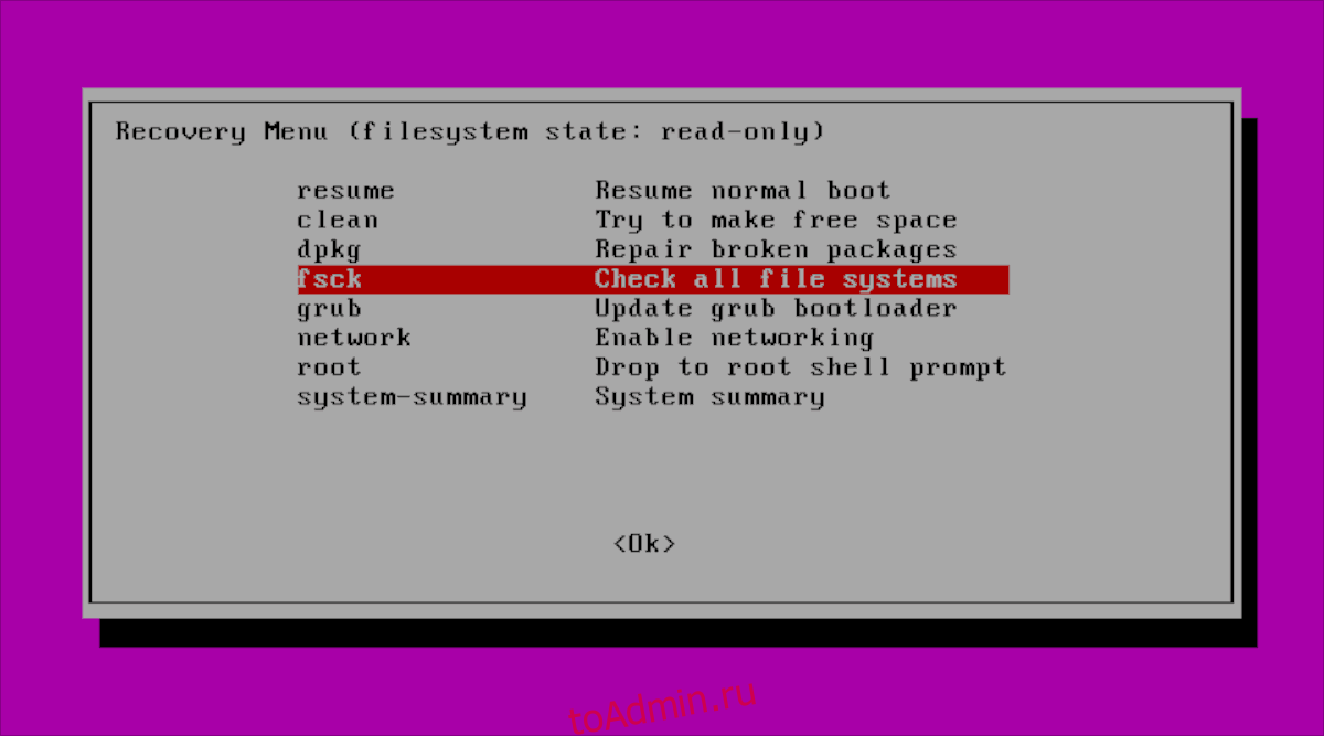 Чтобы использовать «Fsck», выделите его в меню режима восстановления с помощью стрелки вниз, затем нажмите Enter, чтобы запустить его. После этого расслабьтесь и позвольте ему автоматически удалить поврежденные данные.