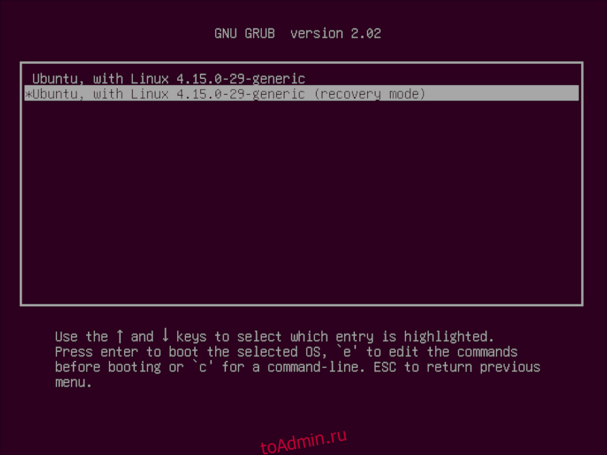 Чтобы загрузить ядро «восстановления» через Grub, нажмите стрелку вниз и переместите селектор Grub в его верх. После этого нажмите клавишу Enter, чтобы система загрузила его.