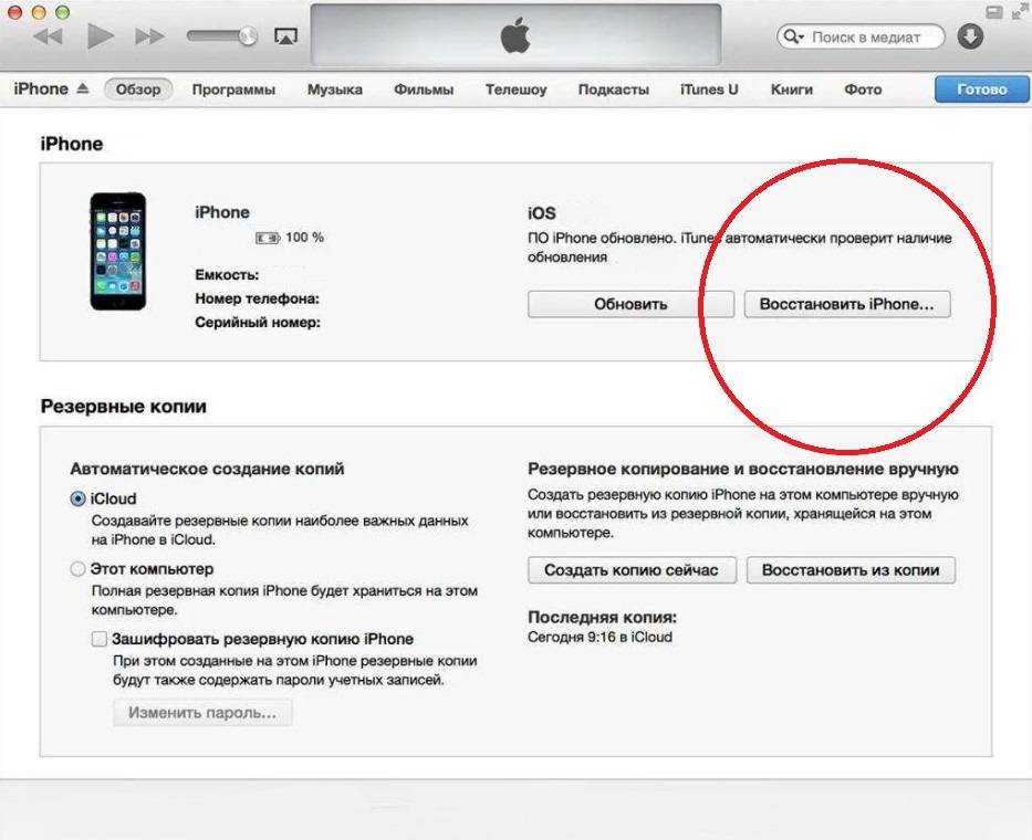 - Еще одним вариантом становится попытка восстановления телефона с помощью iTunes, в случае, если имеется резервная копия. Для этого подключите телефон через USB к компьютеру, зайдите в программу, нажмите «Обзор» и далее «Восстановить iPhone».