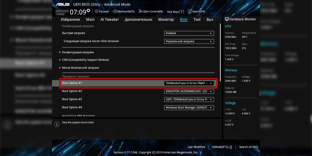 Попав в настройки BIOS, найдите раздел Boot (меню загрузки) и установите на первое место в списке устройств флешку или диск с Windows.