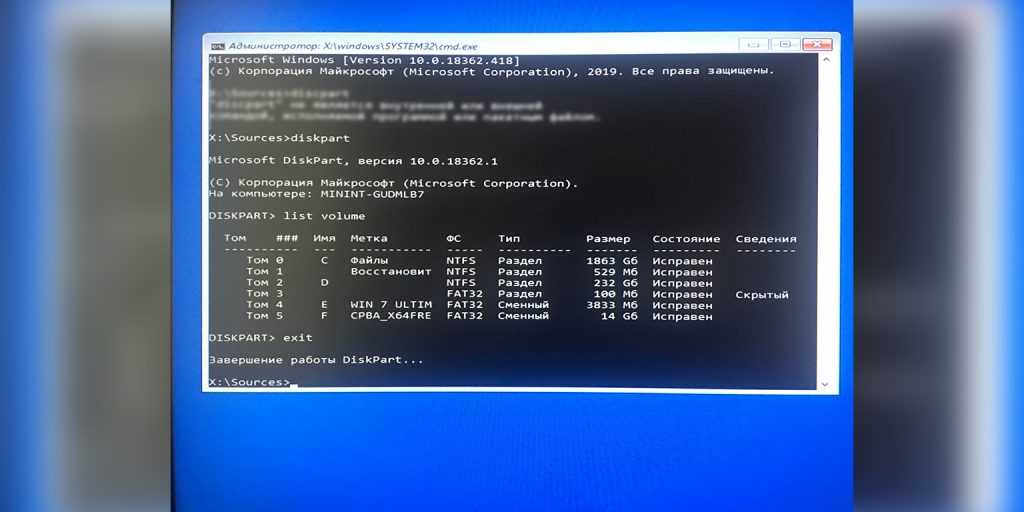 2. Если не сработает, снова зайдите в среду восстановления и выберите опцию «Командная строка». В появившемся окне по очереди введите команды diskpart, list volume и exit. После каждой нажимайте Enter.