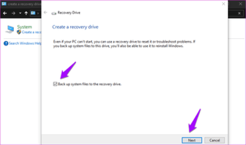 Выберите параметр «Резервное копирование системных файлов на диск восстановления» и нажмите «Далее». Процесс может занять некоторое время. Не вносите никаких изменений в свой компьютер, пока процесс не будет завершен. После этого безопасно извлеките флеш-накопитель. Пометьте его соответствующим образом и храните где-нибудь в надежном месте.