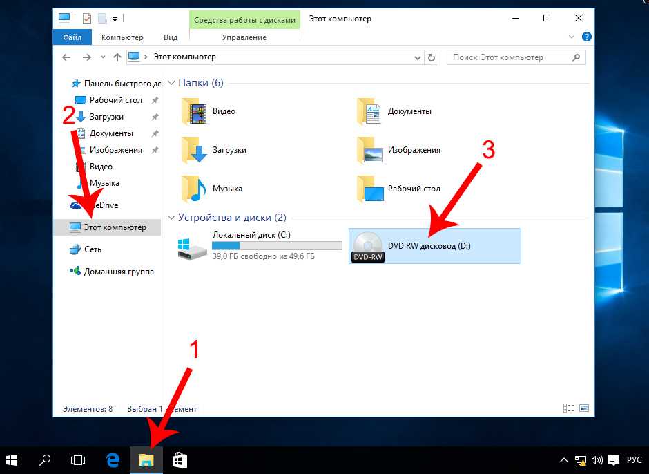 Примечание: Если окно автозапуска не появилось, можете запустить запись диска, нажав: Проводник->Этот компьютер (или Пуск->Компьютер для Windows 7) и в появившемся окне проводника Windows дважды щелкнуть по устройству DVD-RW или CD-RW (в зависимости от типа привода компакт-дисков);