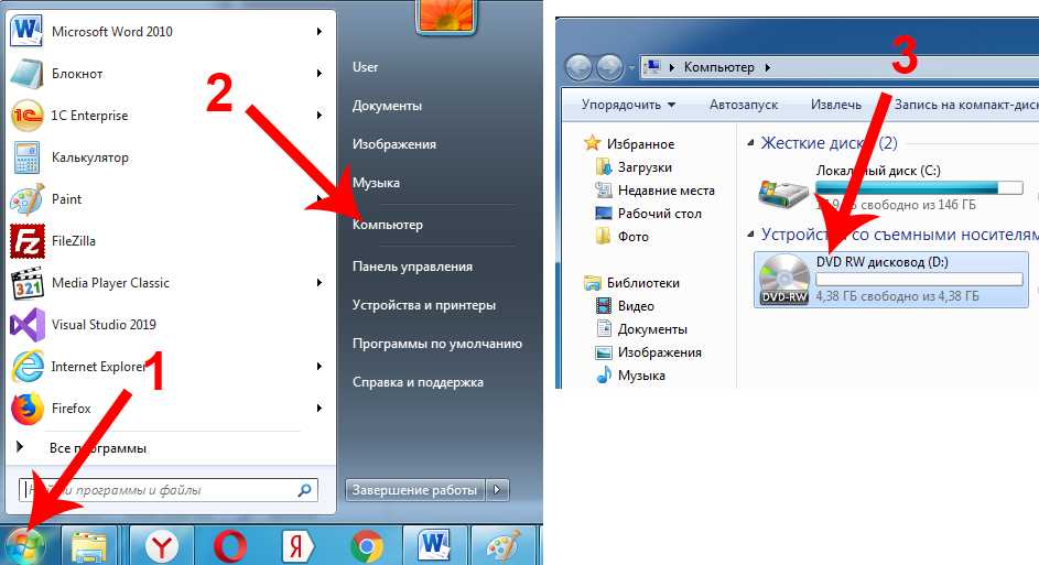 Для начала вам потребуется вставить диск в дисковод. В случае, если система распознает накопитель, ему будет присвоена латинская буква алфавита, а сам он будет отображаться в списке «Устройства и диски».
