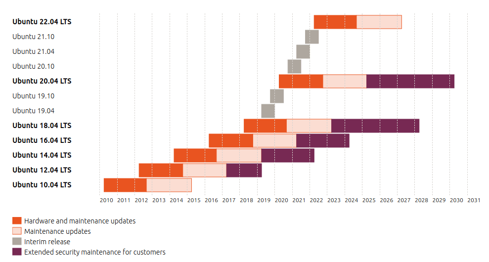 Для Ubuntu разработчики выпускают новую версию дистрибутива каждые 6 месяцев, поддержка которых длится 9 месяцев, после чего для получения обновлений безопасности нужно обновится на новую версию. Кроме этого, каждые два года выходит специальная версия LTS (поддержка в течение длительного периода), которая будет поддерживаться обновлениями безопасности в течении следующих 5 лет.