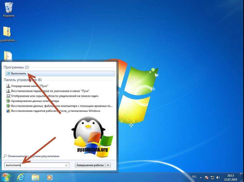 В Windows 7 вызвать окошко «Выполнить» можно открыв пуск и в строке поиска ввести соответствующее слово. Выше вы получите результаты поиска.