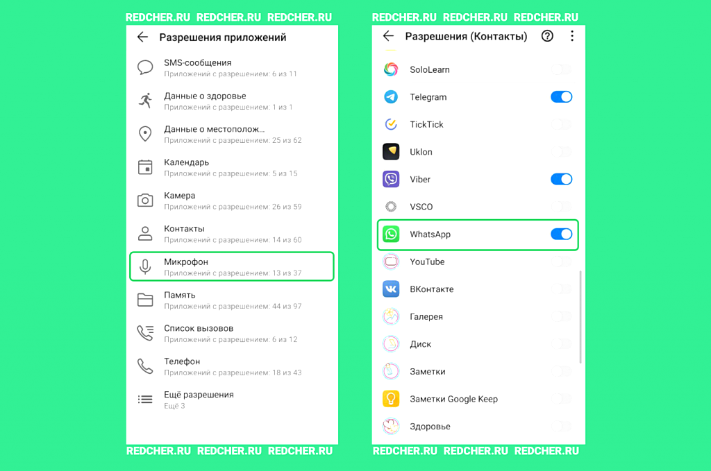 Почему нет звука при звонке в Ватсап? Если собеседник не слышит речь, проблема может быть в отключенном микрофоне. Чтобы исправить ошибку, просто откройте меню с разрешениями и включите микрофон с помощью кнопки справа.