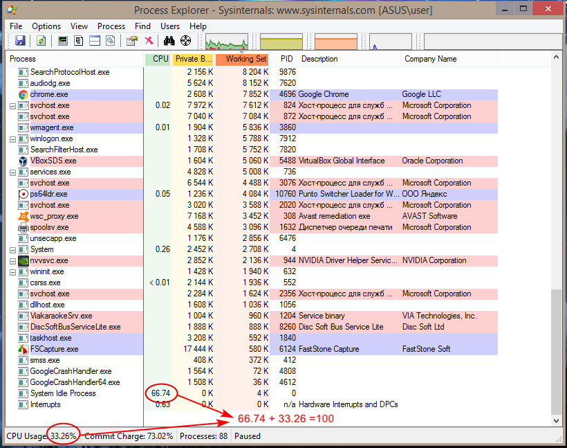Установить факт подмены/заражения процесса «Бездействие системы» можно косвенным путем. Для этого необходимо сложить процент загруженности процесса «Бездействие системы» с общим процентом загруженности всех остальных процессов.