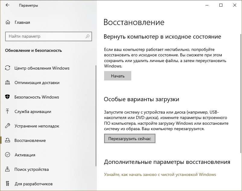 - Слева необходимо кликнуть по вкладке «Восстановление» и найти пункт, именуемый «Особые варианты загрузки». В этом пункте будет всего одна кнопка, на которую требуется нажать.