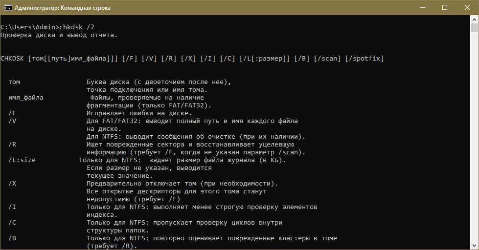 При использовании данных параметров проверки ошибки и повреждения по возможности будут исправляться в автоматическом режиме. Роль параметров в этой команде играют «/F» и «/R». По желанию можно их изменить, чтобы сократить время проверки. Разобраться во всех параметрах несложно: нужно просто ввести соответствующую команду (расположена в самом верху):