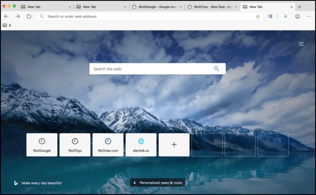 Браузер обладает фирменными фишками вроде коллекций для упорядочивания сохранённого веб-содержимого, а также интеграцией с Office 365 и возможностью совместного использования документов в форматах Word/Excel. При первом запуске предлагает выбрать тип организации рабочего стола – простой, с фоном или новостной лентой