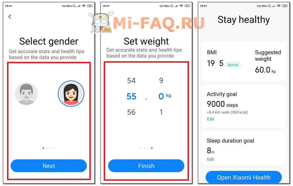 Во время первого запуска программы нужно указать личную информацию: пол, дату рождения, рост и вес. На основе введенных данных Mi Health выдаст персональные рекомендации: идеальный вес, количество шагов, которые нужно проходить ежедневно и сколько часов в день желательно спать.