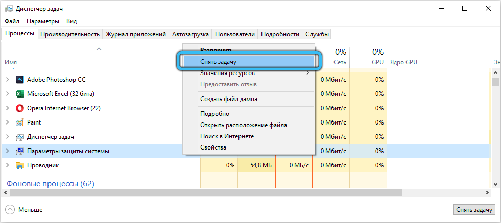 - Щёлкните по наименованию процесса в «Диспетчере задач» и нажмите «Завершить процесс» внизу окна утилиты.