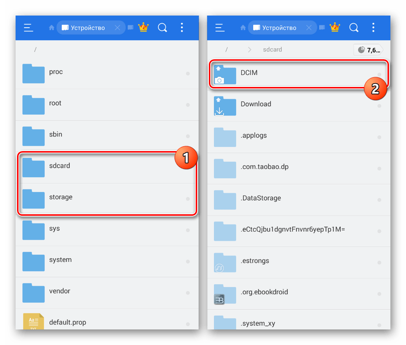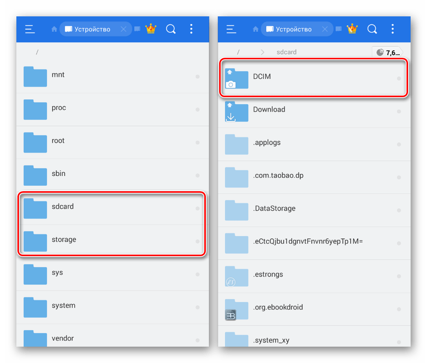 Откройте корневой каталог устройства, выберите папку «Storage» и перейдите в раздел «DCIM». По аналогии с этими можете найти ту же директорию на флешке «sdcard».