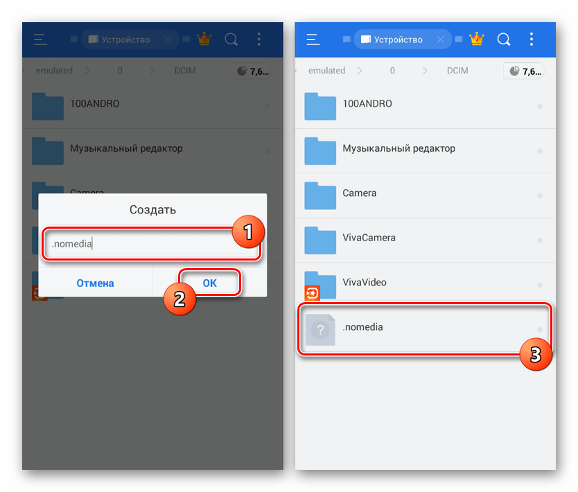 В появившемся текстовом поле впишите .nomedia и нажмите «ОК». Если вы все сделали правильно, внутри каталога «DCIM» появится новый файл неизвестного формата и по умолчанию имеющий тип «Скрытый».