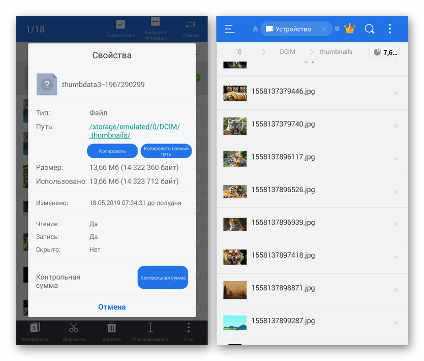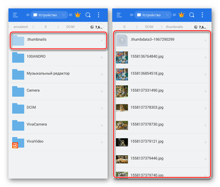 В отличие от большинства папок на телефоне, директория «.thumbnails» по умолчанию скрыта от глаз пользователя и не может быть открыта без файлового менеджера с поддержкой соответствующей функции. Получить доступ к папке можно посредством одного из файловых менеджеров, который, помимо отображения всех содержащихся внутри документов, включая скрытые, позволит произвести удаление.