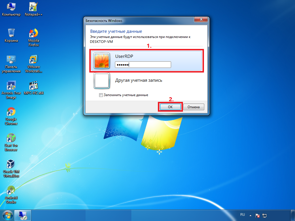 3. Прежде всего, выберите пользователя (прим. в данном примере это UserRDP) и введите пароль от учётной записи, который Вы указывали ранее (прим. см. Рис.5), затем нажмите OK (Рис.23).