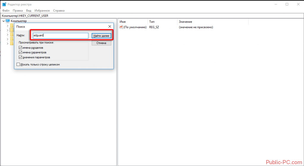 После чего откроется реестр операционной системы, нажимаем сочетание клавиш Ctrl+F и в поисковой строке вводим «adguard» и нажимаем Enter.