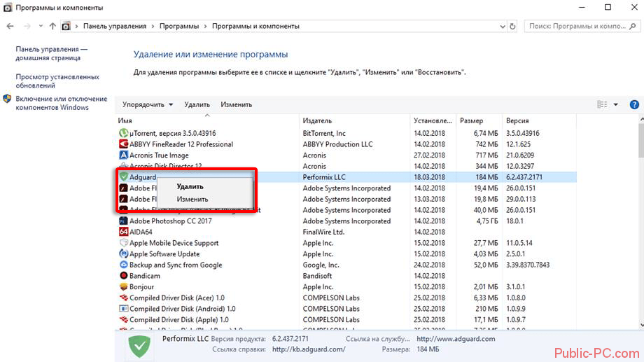 В появившемся окне «Программы и компоненты» находим программу Adguard нажимаем по ней правой кнопкой и в выпавшем меню выбираем «Удалить».