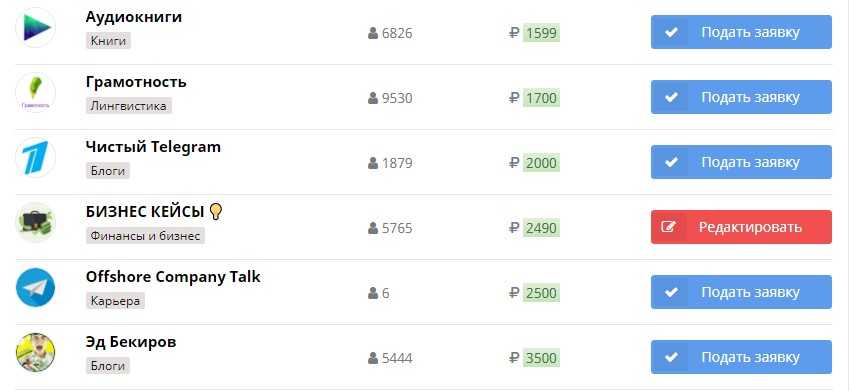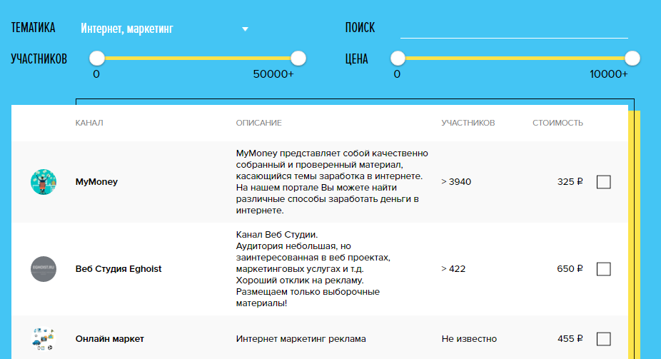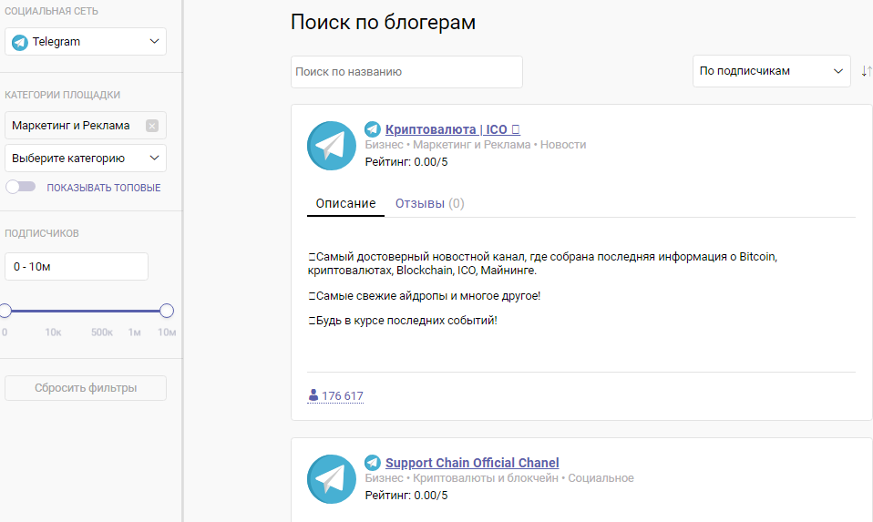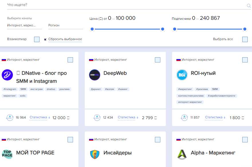 Биржа с каталогом каналов, можно фильтровать по категории, количеству подписчиков и отзывчивости — внутренней метрике сервиса. У каждого канала выводится статистика с общим количеством подписчиков. При сделках нужно заплатить комиссию 10%.