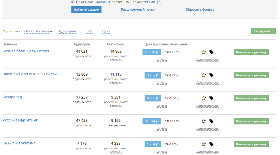 Сервис не требует регистрации, бесплатен. Показывает рейтинг подходящих каналов для рекламы, выводит каналы по теме, числу подписчиков, рекламному охвату, цене за пост. Рассчитывает CRM — во сколько вам обойдется 1000 показов на канале.