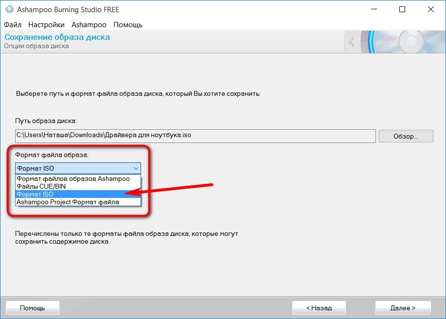 А далее что и остаётся нам, так это указать путь сохранения образа диска на компьютере и выбрать формат файла на выходе ISO, если, конечно же, принципиально не нужен иной формат образа диска. Таковых программа предусматривает немного: кроме сторонних форматов ISO, IMG и CUE/BIN, остальные — это форматы софта Ashampoo.