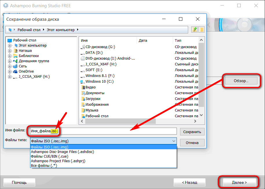 Единственный нюанс необходимо учесть при выборе своего места сохранения образа диска. После нажатия кнопки обзора и выбора нужной папки в окне проводника необходимо вместе с именем указать через точку и расширение файла по типу «Имя_файла.iso» (для большинства случаев) или «Имя_файла.img». Жмём «Далее» для старта процесса.