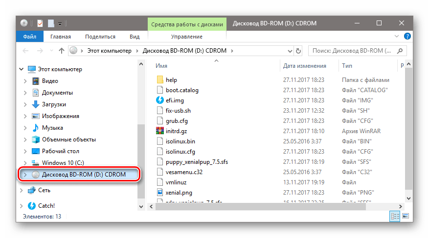 Откроется окно «Проводника» с показанным содержимым NRG-файла (вдобавок к этому система должна определить новый накопитель и показать его в «Этом компьютере»).
