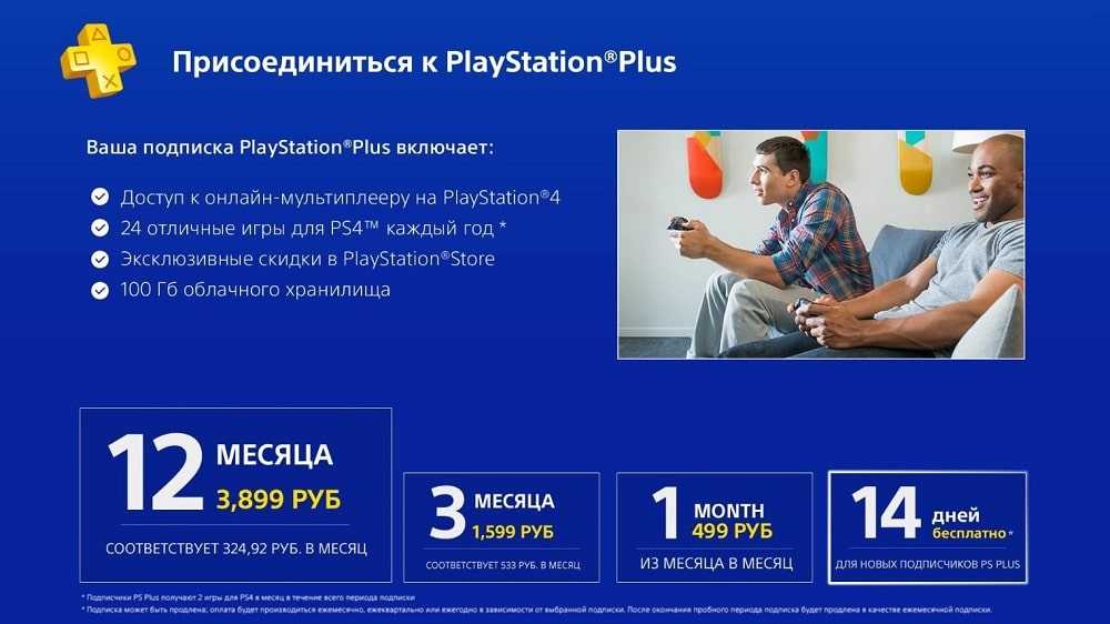 Сколько стоит «Плюс»? Тут многим может показаться, что всё не так утешительно. Один месяц обойдётся в 449 рублей, три месяца — 999 рублей. Но зато годовую подписку PlayStation Plus можно приобрести за 3199 рублей. На самом деле это позволит хорошо сэкономить, ведь за год вы получите 24 видеоигры для своей консоли, каждая из которых стоит примерно тысячу рублей.