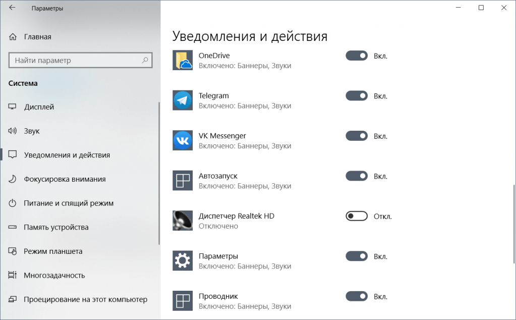 Убрать уведомления о подключении/отключении устройств не трудно — достаточно зайти в Параметры > Система > Уведомления и отключить их у диспетчера Realtek HD: