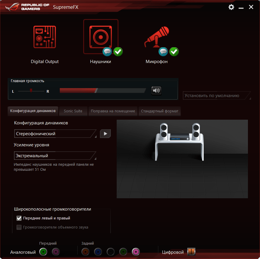 Чтобы задать параметры акустических систем:Конфигурация микрофона Для настройки микрофона перейдите на вкладку «Микрофон» (Mic in). Вверху основного окна вы увидите параметры усиления и громкости микрофона. Отрегулируйте ползунок до комфортного формата.