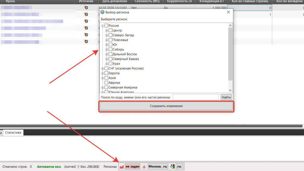 - В нижней части программы находятся настройки регионов. Первая слева отвечает за Яндекс.Вордстат, вторая — за Яндекс.Директ и третья за Гугл.